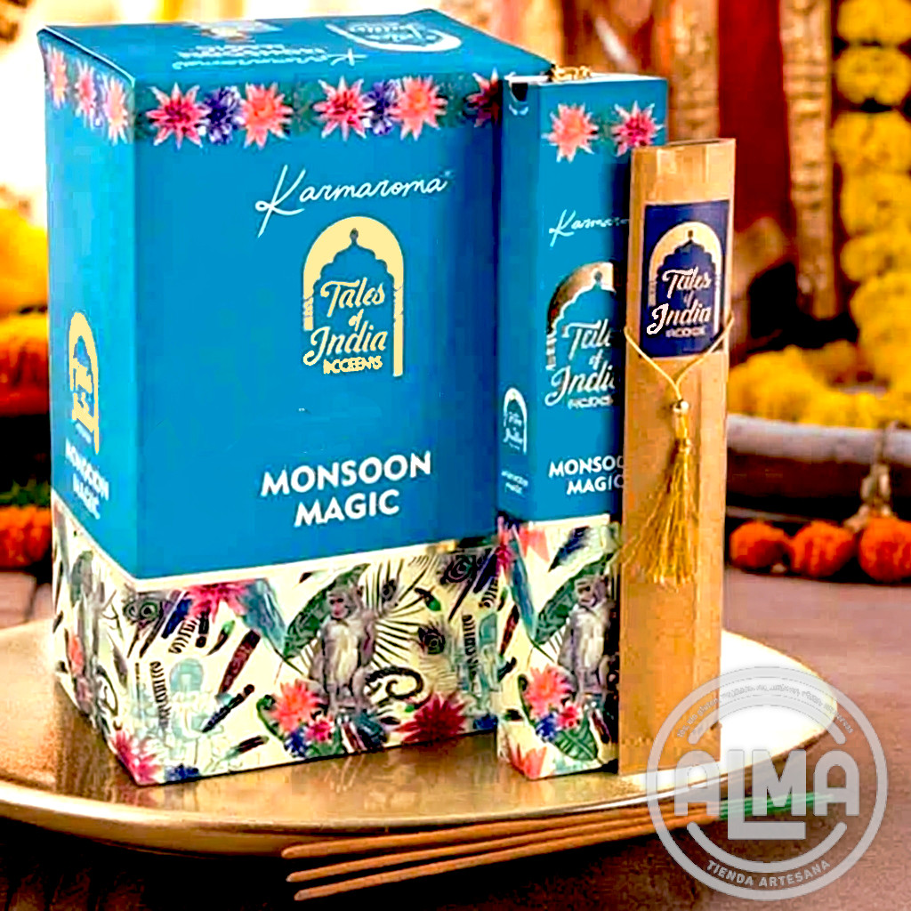 Las varillas de incienso de Karmaroma Tales of India-Monsono Magic:capturan la esencia de la tierra refrescada por las lluvias monzónicas, combinando el aroma fresco y persistente de la tierra húmeda con notas musgosas y toques de hojas verdes. Evoca la sensación revitalizante de la lluvia cayendo sobre el suelo seco, creando una atmósfera de frescura y renovación.