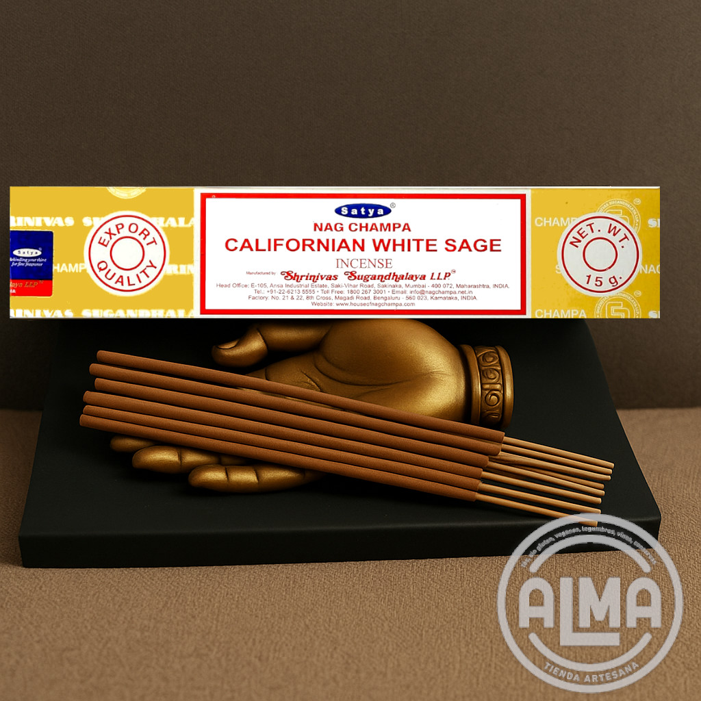 Californian White Sage (Salvia Blanca de California): la salvia blanca es una planta sagrada usada para la limpieza energética. Este incienso Satya purifica espacios, disipa energías densas y restaura la armonía espiritual, siendo ideal para iniciar meditaciones o limpiezas energéticas profundas.